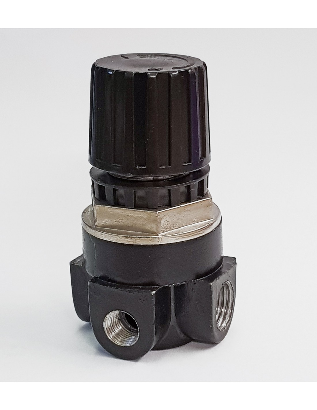 Regulator Manifold 4 port. 3 x 1/4"BSP, 1 x 1/8"BSP. Allows control of outlet pressure to 2 ports (common), with an extra port for attachment of pressure gauge (1/8"BSP).