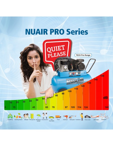 The NUAIR range of TECH PRO series compressors have been designed to offer maximum user comfort in terms of ease of use, simple controls, portability, conveniences and lower noise levels. Available as Direct Drive or Belt Driven variants features include: