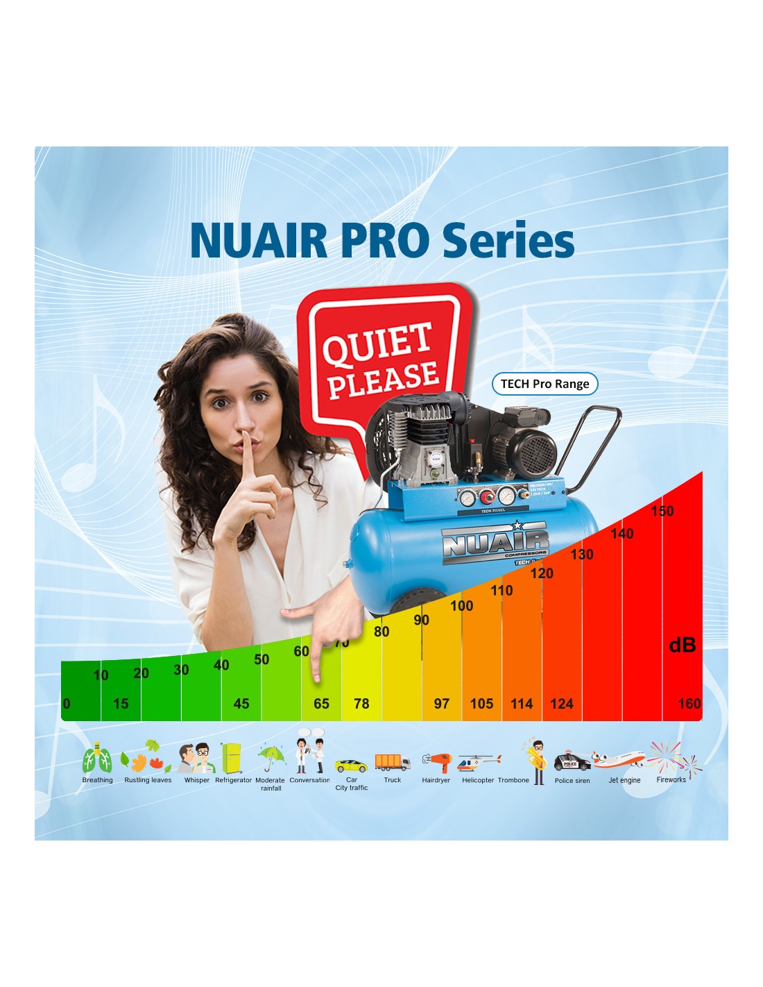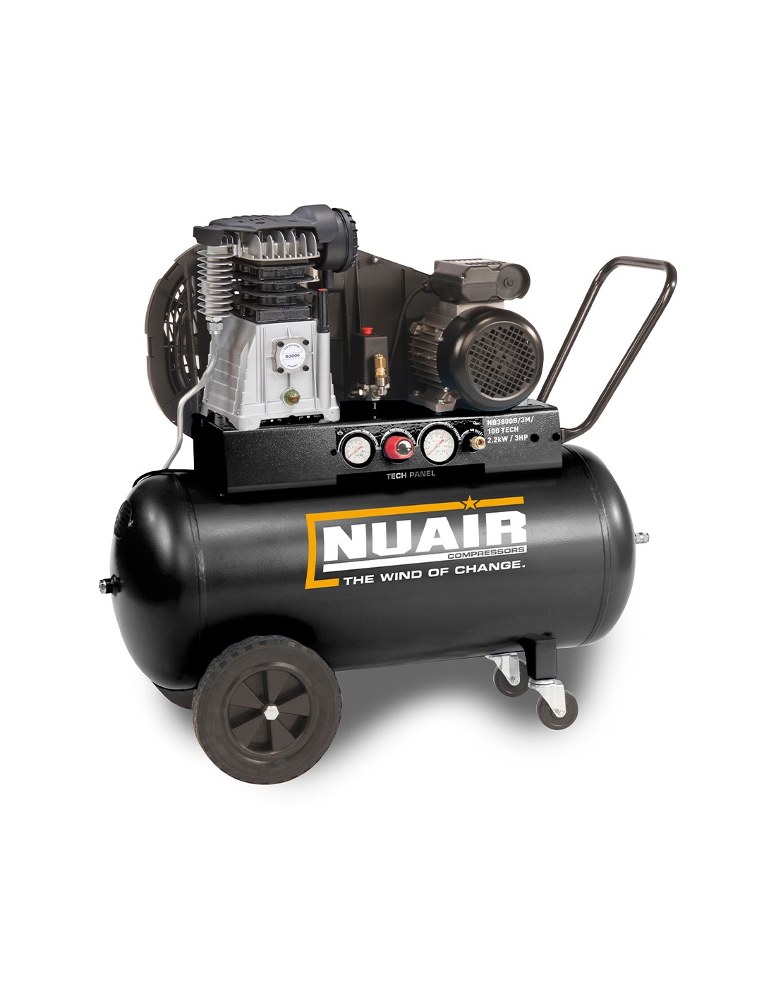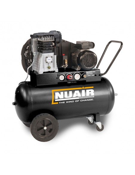 The NUAIR range of TECH PRO series compressors have been designed to offer maximum user comfort in terms of ease of use, simple controls, portability, conveniences and lower noise levels. Available as Direct Drive or Belt Driven variants features include: