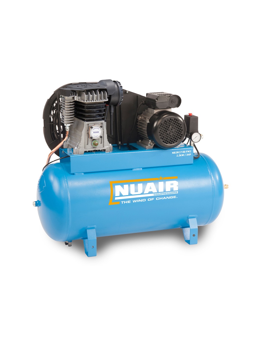 The NB 28C/100 FM3 PRO is a popular workshop belt drive compressor suitable for various applications. The proven design ensures reliability and continued performance. Ideal for workshops and applications with access to a Single phase power supply and fitted with a larger 100Lt air receiver for greater storage