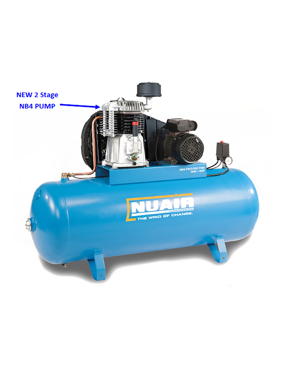 Introducing the NEW NuAir NB4-200 FM4 TWO STAGE Super High Performance Air Compressor, engineered for those who demand superior airflow in environments with limited power availability. This advanced two-stage compressor stands out with its remarkable Free Air Delivery (FAD) performance, boasting an impressive output of 15.5 CFM (438 L/min*). With its robust design, this unit is available in both a convenient single-phase (230V/20A) option and a powerful 400V three-phase variant, making it versatile enough to meet a variety of operational needs. Whether you’re looking to enhance your productivity or maximise air capacity, the NuAir NB4-200 FM4 is the ideal solution for your air compression requirements.